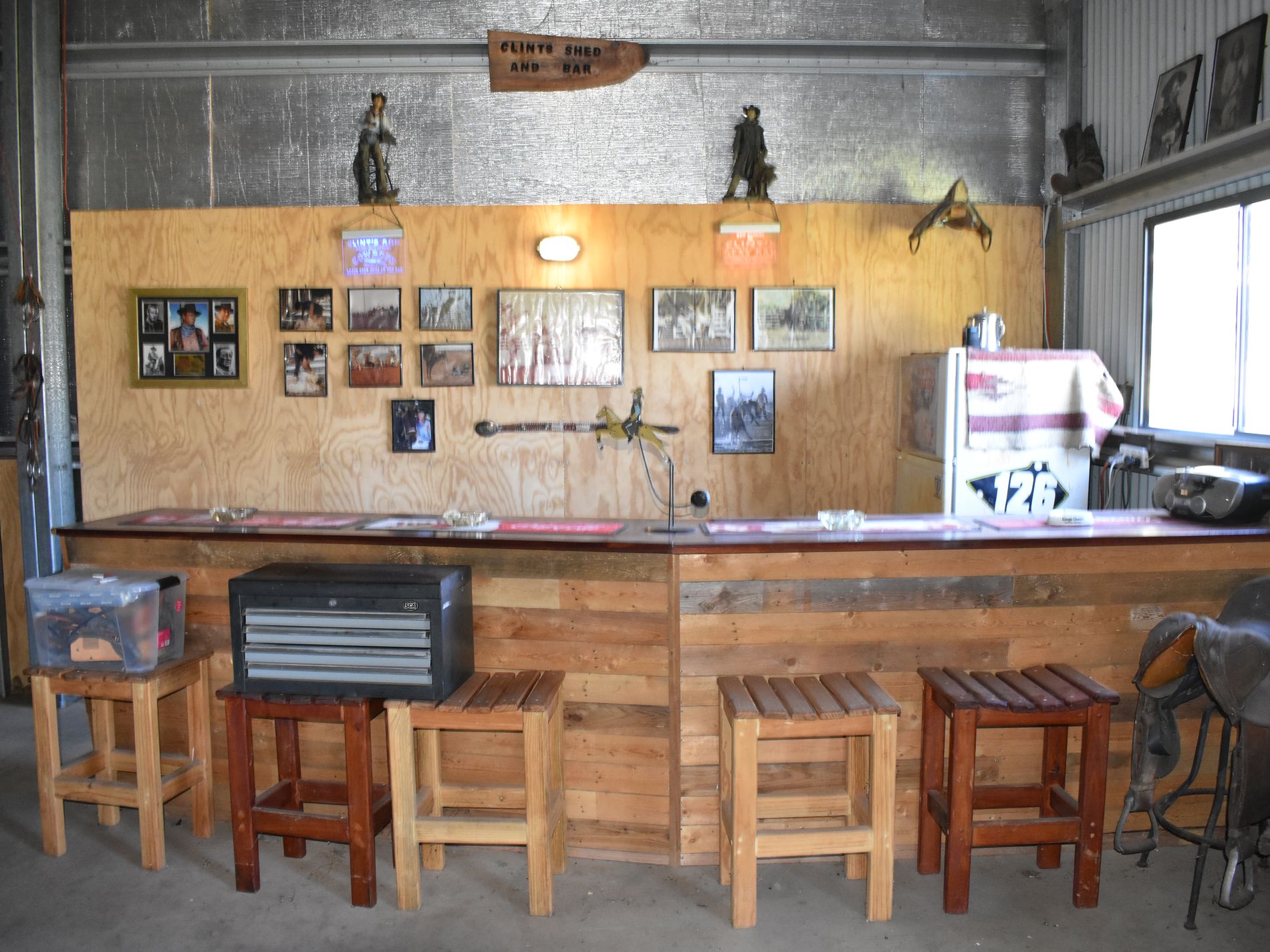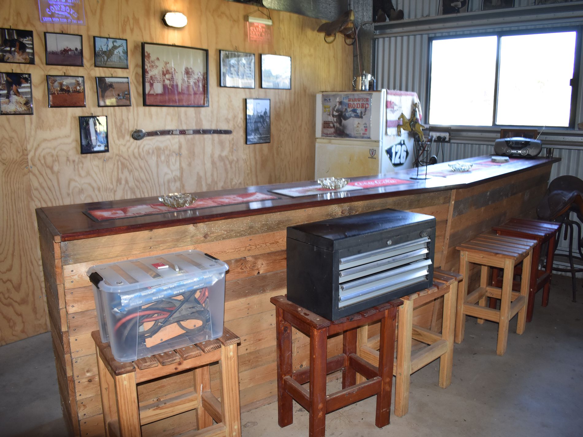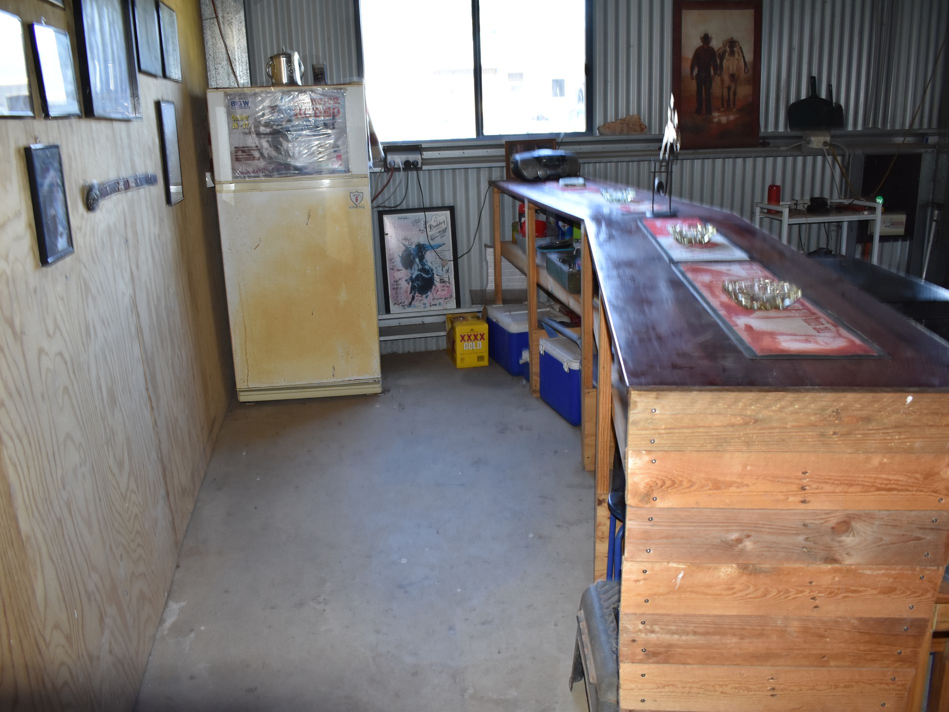 • Approx. 24m x 12m shed, half converted into a fully set-up man cave with bar, pot belly stove, shower, and toilet