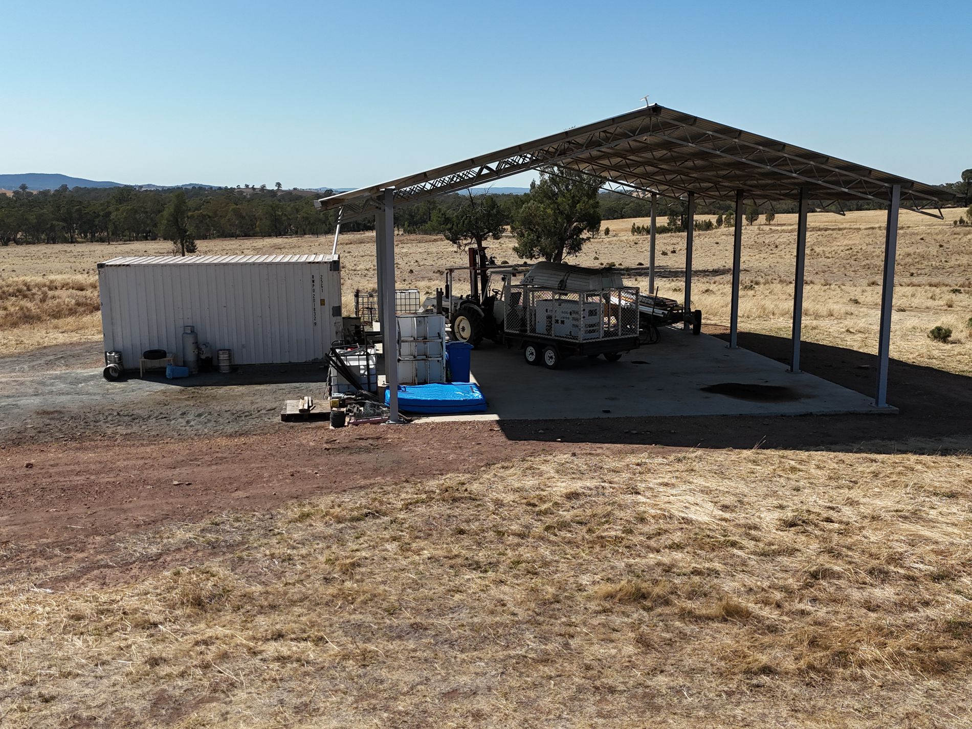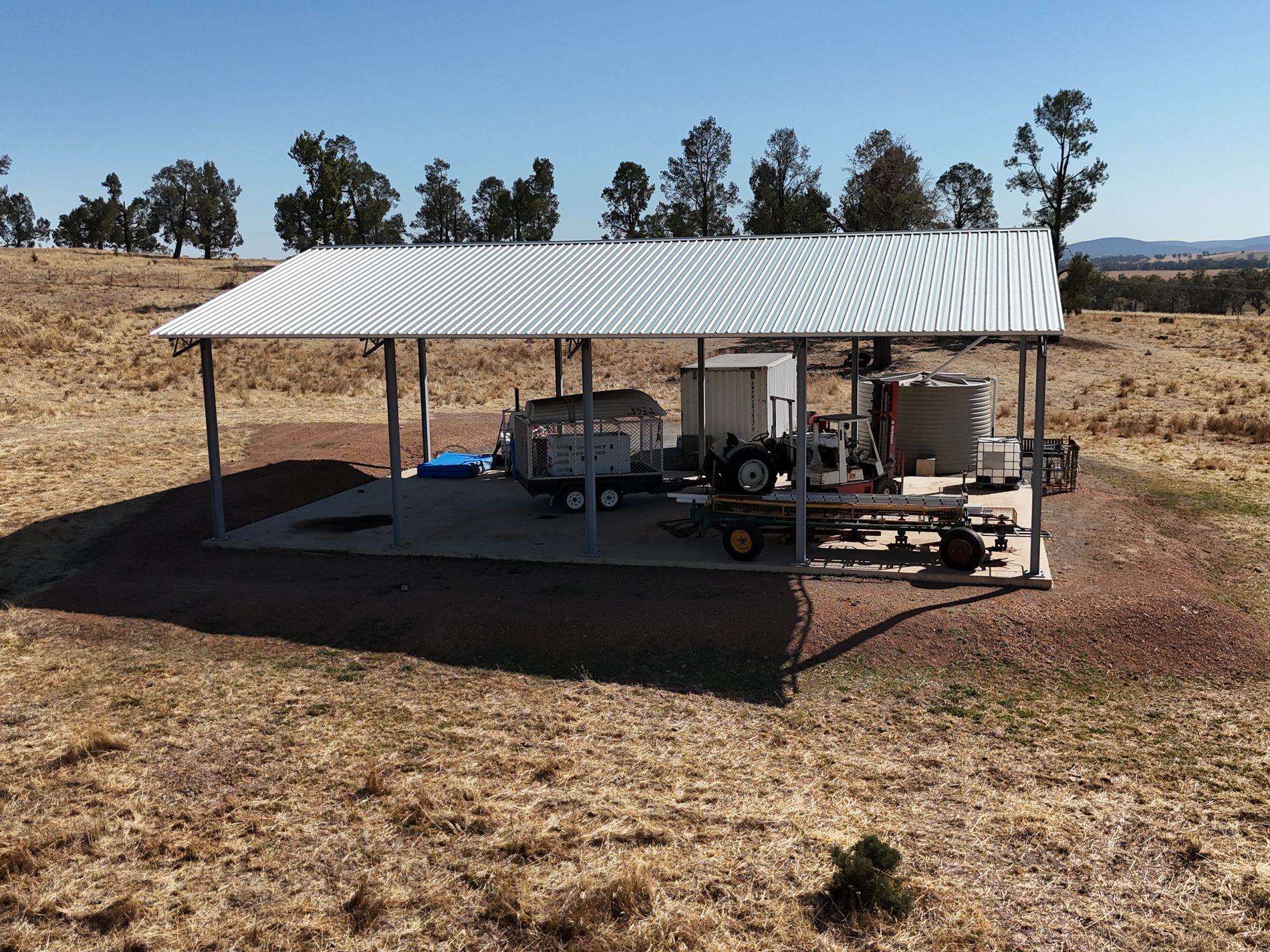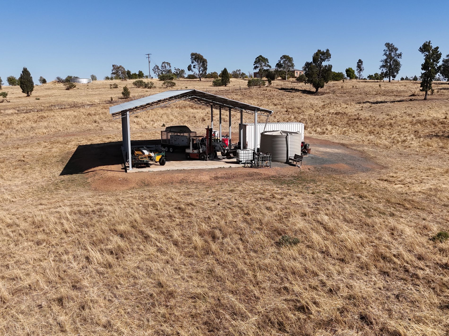The property features a substantial 11m x 16m x 7m hay/machinery shed, an equipped bore, and rainwater storage, making it well set up for future development or agricultural use.